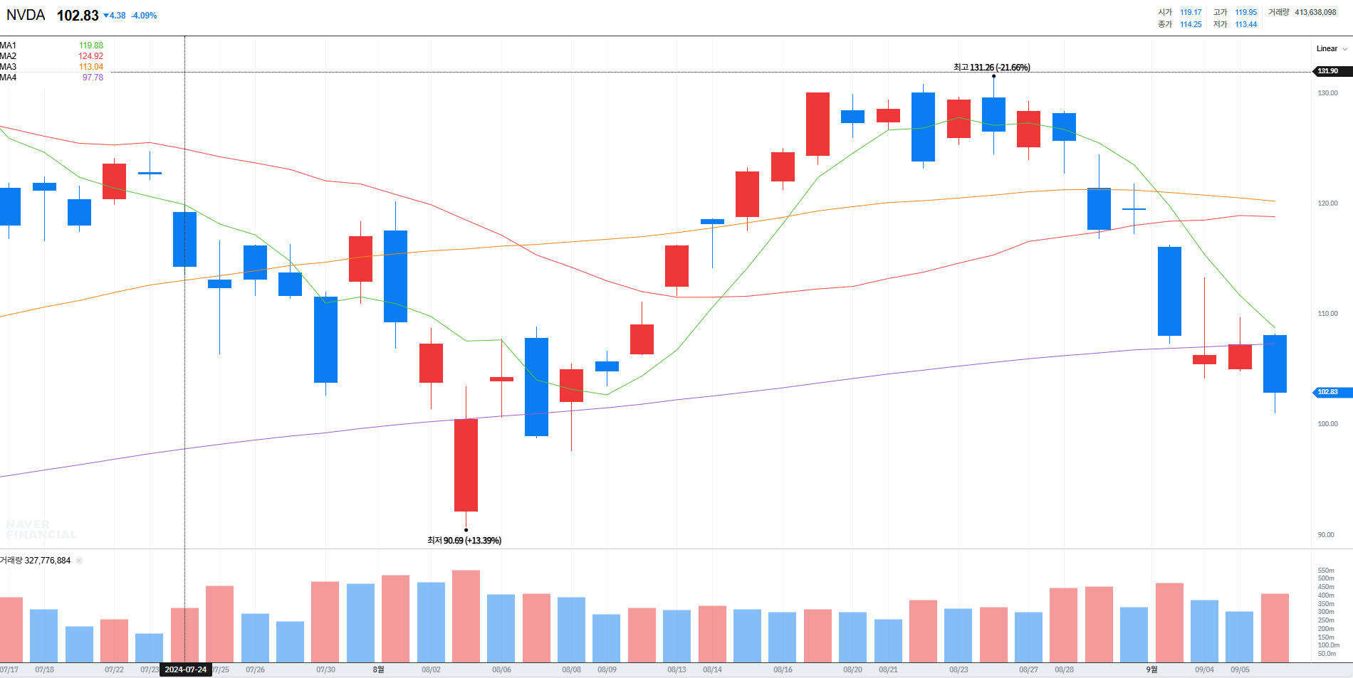 미국 주식장이 안좋았기 때문인데, 특히 엔비디아가 폭락하며 주당 104달러까지 하락했기 때문이였는데요,